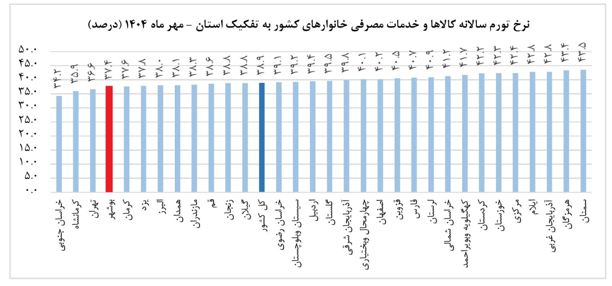 به گزارش مرکز آمار، در حالی که تورم سالانه کشور در مهرماه به ۳۸/۹ درصد رسیده و دامنه تغییر آن میان دهکهای هزینهای از ۳۸/۲ تا ۴۰/۱ درصد در نوسان است، فاصله تورمی استان بوشهر با عدد ملی چندان زیاد نیست. با این حال، بررسی جزئیات نشان میدهد روند تورم در بوشهر در بخشهای خوراکی و کالاهای مصرفی سرعت بیشتری دارد و در نتیجه، گرچه وضعیت کلی استان کمی متعادلتر از میانگین کشوری است، اما سبد معیشت خانوارهای بوشهری تحت فشار محسوس قیمتها قرار دارد.
